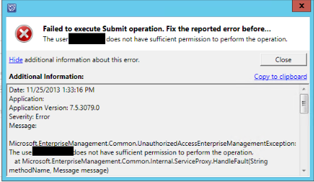 Microsoft.EnterpriseManagement.Common.UnauthorizedAccessEnterpriseManagementException: The user CONTOSO\User1 does not have sufficient permission to perform the operation.