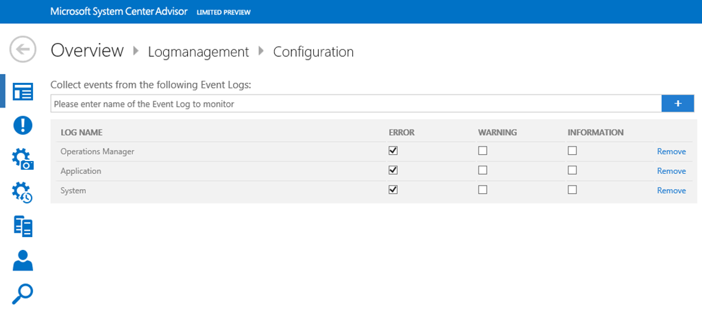Here you need to enter which event logs you want to gather information and at what error level. It is very simple you just enter the display name for event log and check what level of logging. As you can see in my example I’ve added 3 event logs and only error events to be gathered for them. A couple of hours later you will see the count for the gathered events on the different event logs being raised.