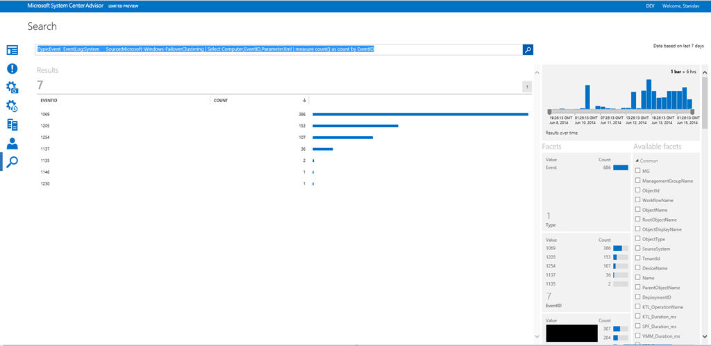 Type:Event EventLog:System Computer:”server.contoso.com” Source:Microsoft-Windows-FailoverClustering | Select Computer,EventID,ParameterXml | measure count() as count by EventID