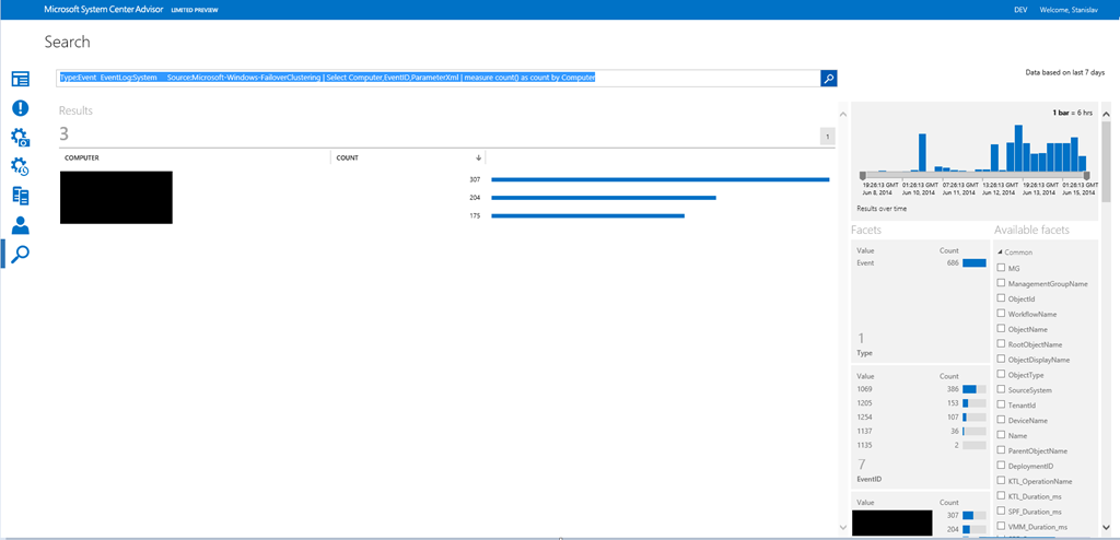 Type:Event EventLog:System Source:Microsoft-Windows-FailoverClustering | Select Computer,EventID,ParameterXml | measure count() by TimeGenerated interval 1DAYS