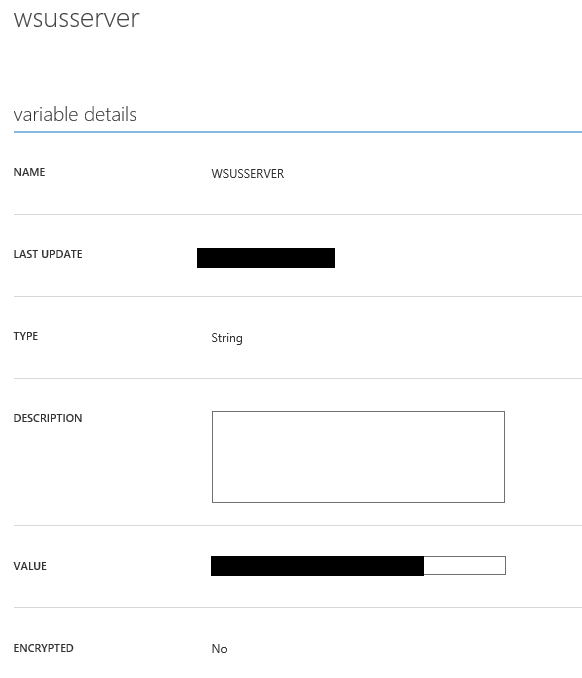 $WSUS = Get-AutomationVariable -Name ‘WSUSSERVER’
