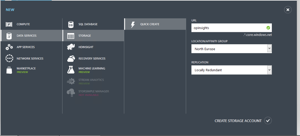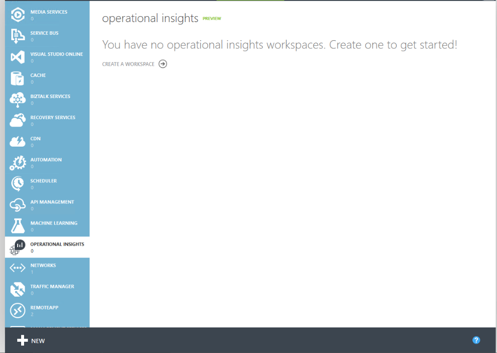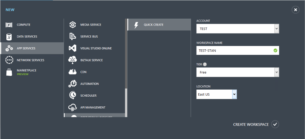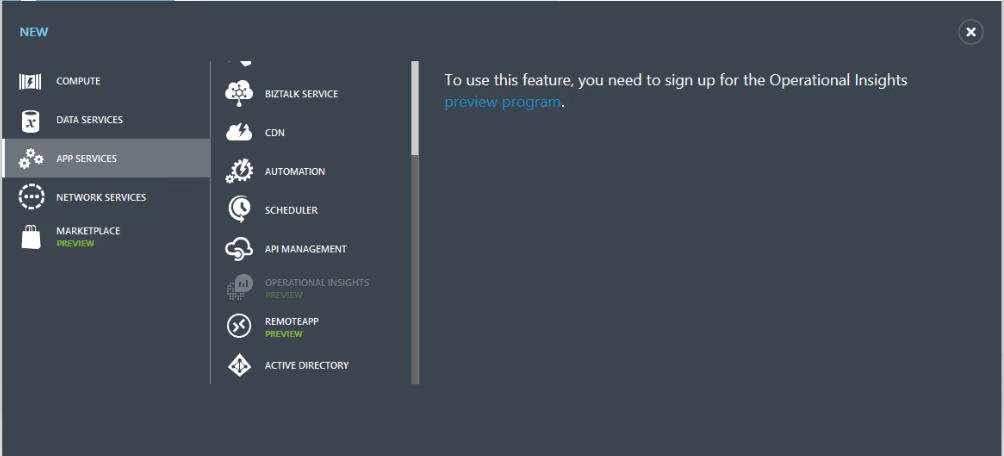 So the first step is to go to the Microsoft Azure portal and logon. In mu scenario I am using the same account that I logon to Operational Insights, After that you will go to New -> App Services –> Operational Insights.