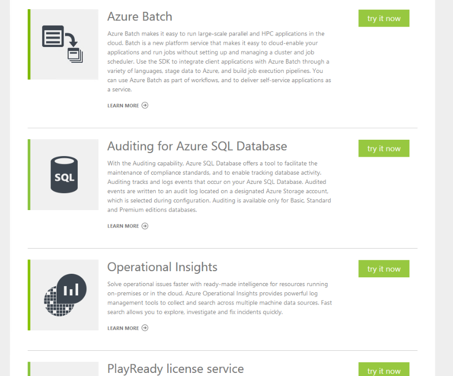 That redirects you to the preview services in Azure. Against Operational Insights click Try it now: