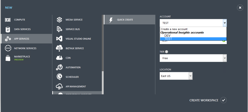 As you can see from the options for workspaces Azure knows that I have existing accounts in Operational Insight and I can select to create brand new clean state workspace or create new workspaces with one of my existing Operational Insight accounts.