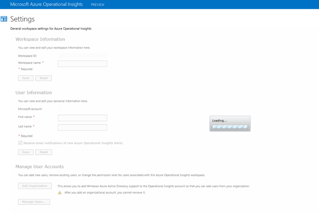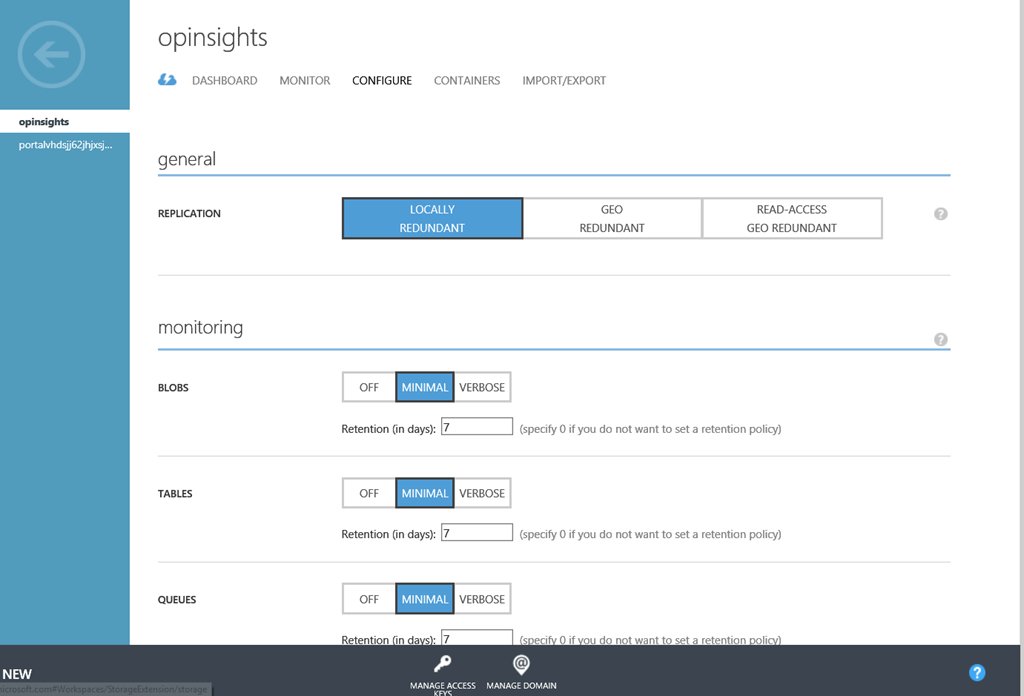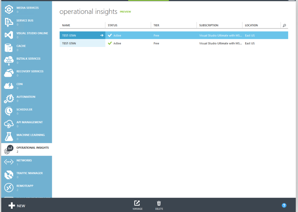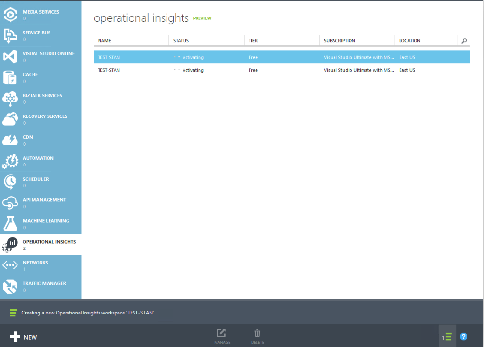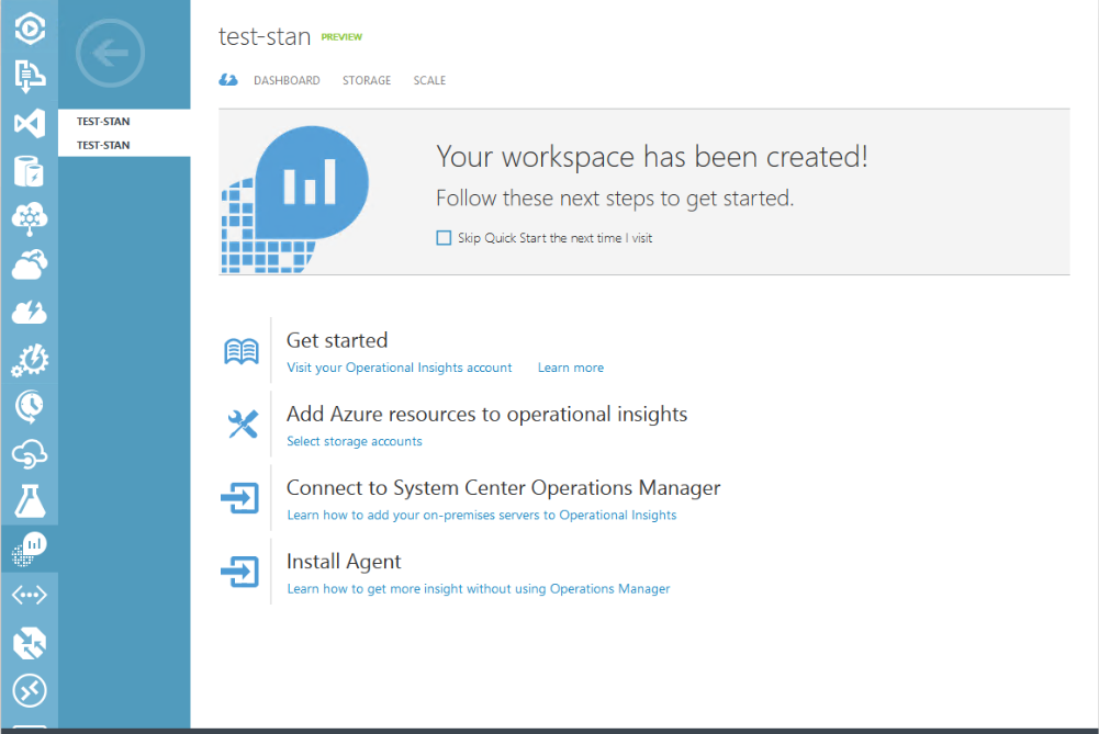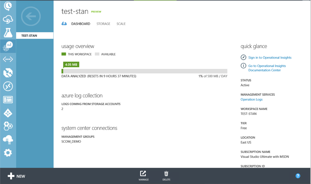 A few seconds later and the workspace is ready. Clicking on Manage opens the Operational Insights portal on your settings page: