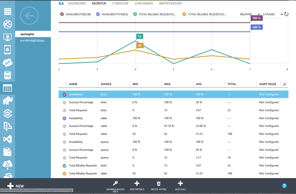 The good part of the ability to associate Azure Storage account is that you can configure that Storage account to show you monitoring information like availability, successful requests and etc.: