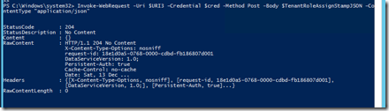 Invoke-WebRequest -Uri $URI3 -Credential $cred -Method Post -Body $TenantRoleAssignStampJSON -ContentType "application/json"