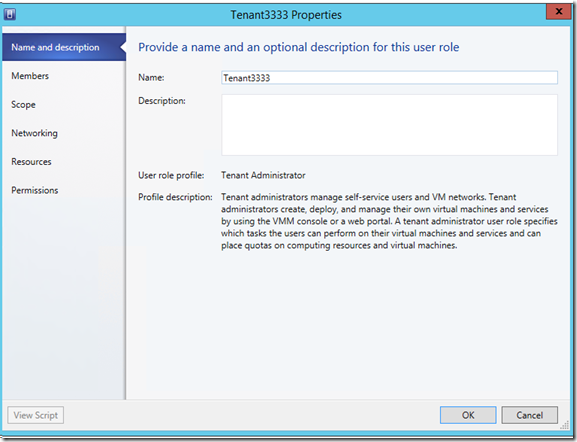 Now that we have the Tenant in SPF the next step is to create the same tenant in VMM. Basically creating User Role in VMM with the same name and ID as the SPF tenant links them. That easily happens trough SPF by assigning they created SPF Tenant to Stamp: