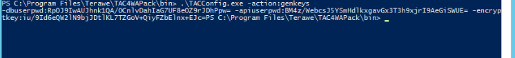 The keys are generated along with the actual parameters that are needed for the configuration command. Keep in mind that the encryption key ends right before PS C:\Program Files\Terawe\TAC4WAPack\bin>