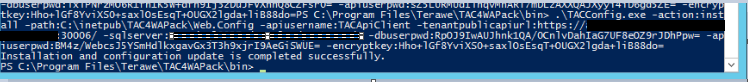 .\TACConfig.exe -action:install -path:C:\inetpub\TAC4WAPack\Web.Config -apiusername:TACApiClient -tenantpublicapiurl:https://WAPServer.contoso.com:30006/ -sqlserver:WAPSQL.contoso.com -dbuserpwd:RpOJ9IwAUJhnk1QA/0CnlvDahIaG7UF8eOZ9rJDhPpw= -ap