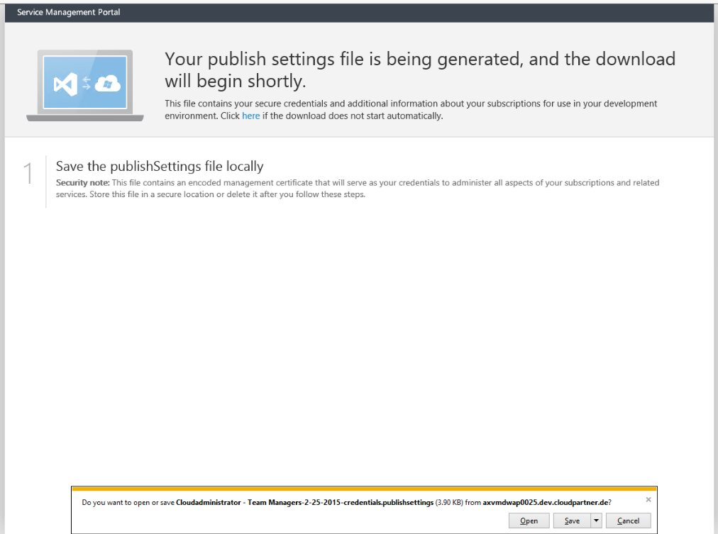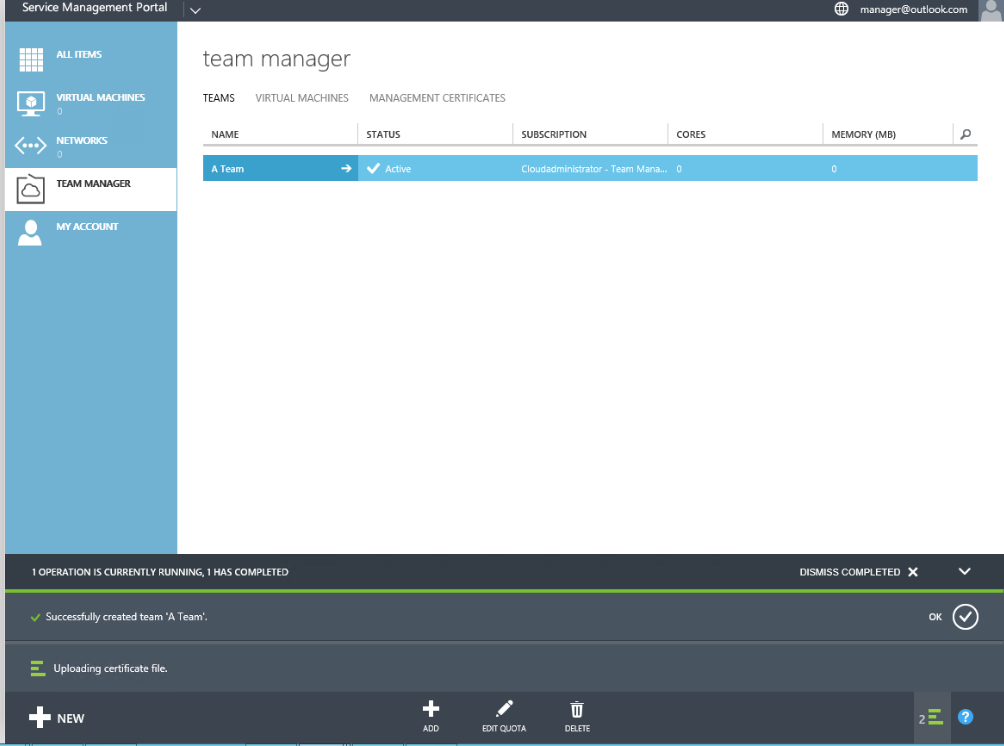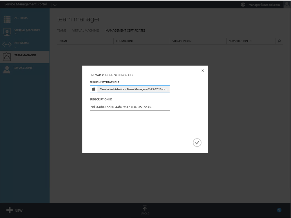 When you download that file you go again to Tenant portal –> Team Manager –> Management Certificates –> Upload