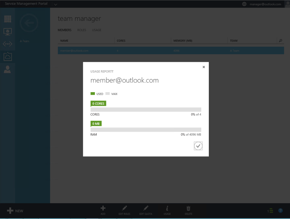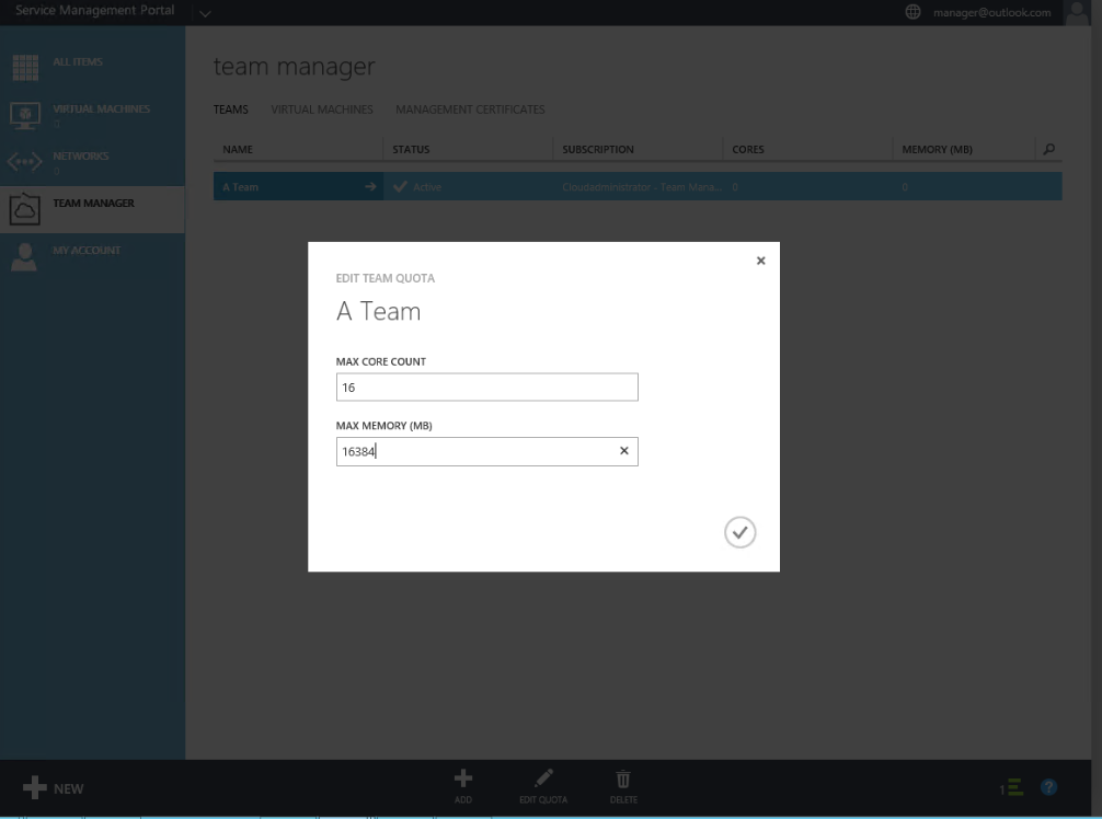 Once we have team we can assign quota to that team in the form of cores and memory: