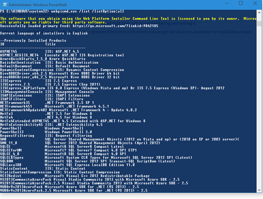 So let’s get started. As I’ve said it is available at Web Platform installer and after you install Web PI you can easily get the setup with simple commands. Web PI has command line tool with which we can get all solutions available for install/download: