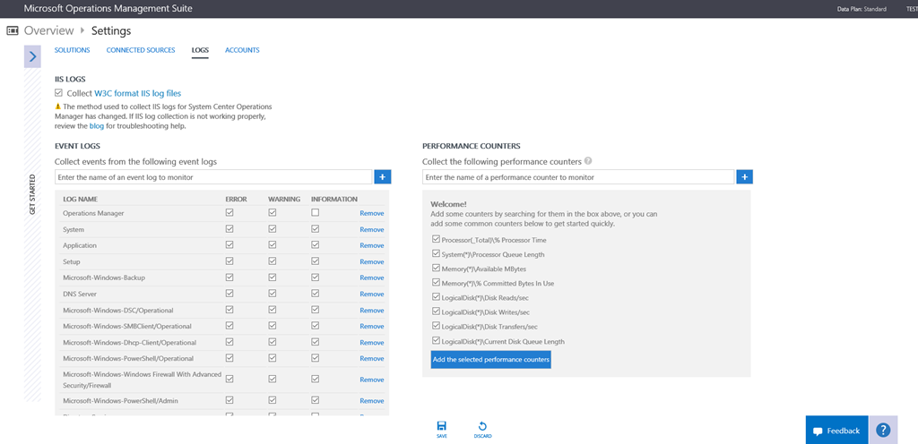 When you navigate to Logs initially you will see a box which will help you to add the most common performance counters initially: