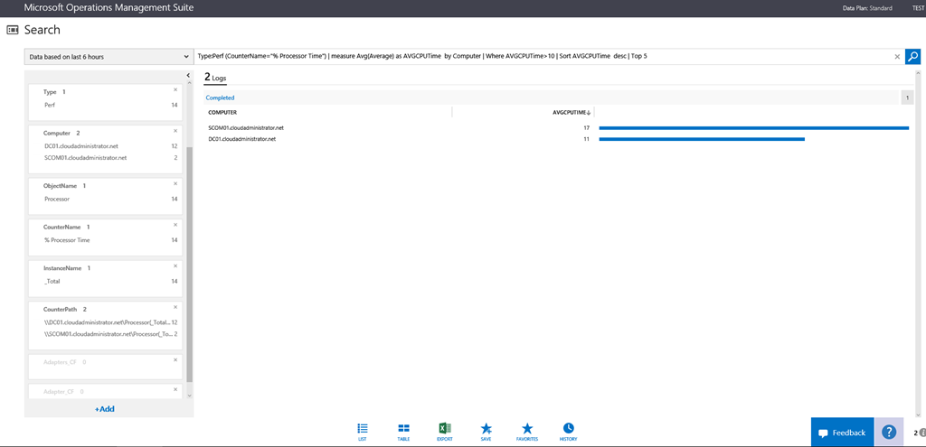 Type:Perf (CounterName=”% Processor Time”) | measure Avg(Average) as AVGCPUTime by Computer | Where AVGCPUTime>10 | Sort AVGCPUTime desc | Top 5