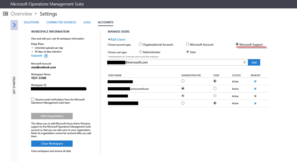You probably have been in situation where you cannot resolve issue on your own. In that case you will usually contact the support team of the software vendor. When that contact is initiated usually results in uploading some kind of logs to the support engineer. It is slow and cumbersome process. Operations Management Suite has the capability to ingest a large amount of logs from any server no matter where is located. With that in mind OMS now has small but helpful feature. Now you can add access to users from Microsoft.com domain to your OMS workspace: