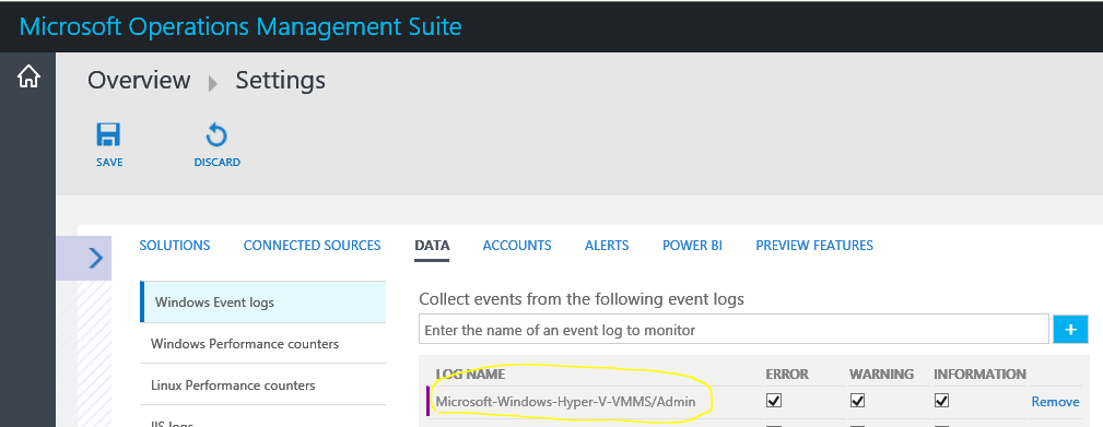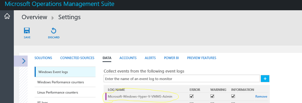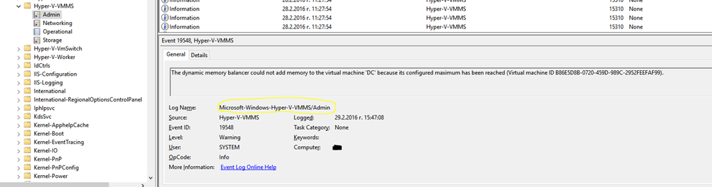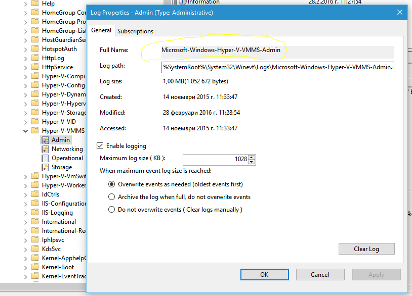 Let’s say you want to add the Admin event log for Hyper-V-VMMS. In that case you will usually go to Event viewer and find the needed log.