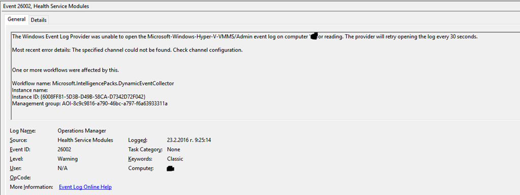 If new events are not shown after that time you will also see Event ID 26002 showing up in the Operations Manager log. That event will which particular log was not found on this machine: