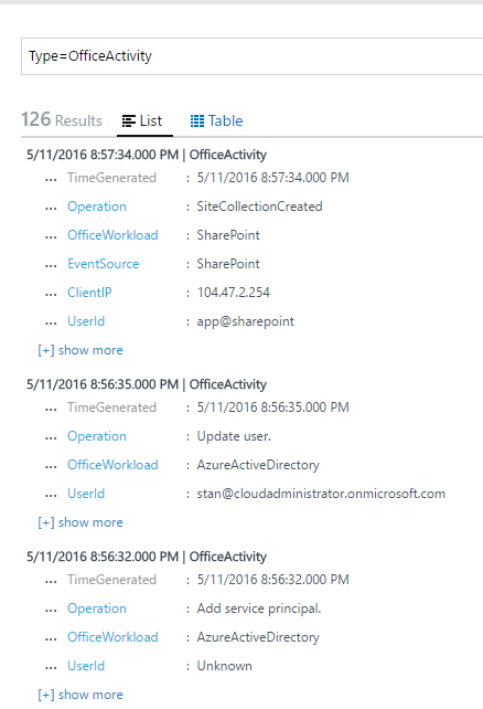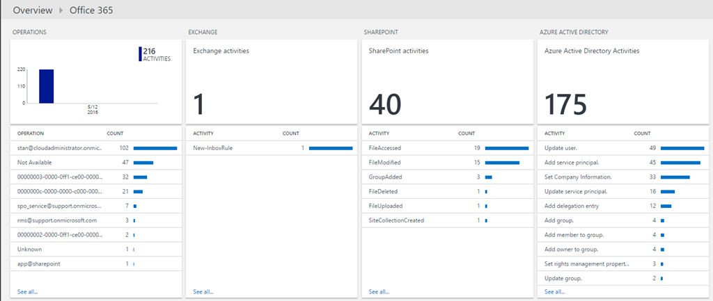 As you can see you have all operations (all Office 365 logs) and separate blades for the different logs.