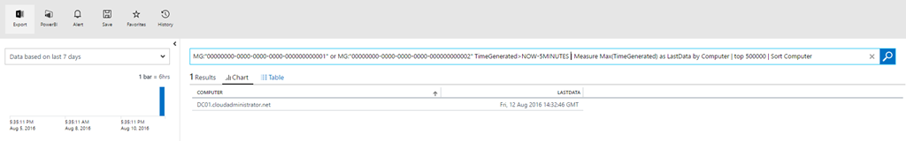 MG:”00000000-0000-0000-0000-000000000001″ or MG:”00000000-0000-0000-0000-000000000002″ TimeGenerated>NOW-5MINUTES | Measure Max(TimeGenerated) as LastData by Computer | top 500000 | Sort Computer