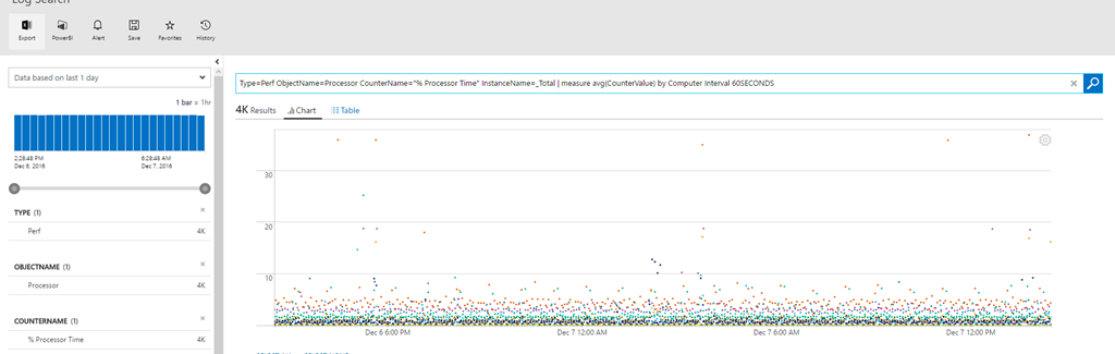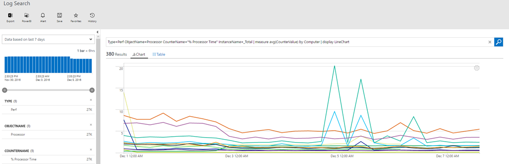 Type=Perf ObjectName=Processor CounterName=”% Processor Time” InstanceName=_Total | measure avg(CounterValue) by Computer | display LineChart