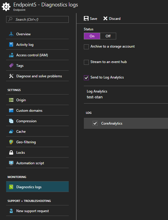 Now let’s pump some data. I have created Verizon CDN profile and Endpoint that originates from Storage account. To configure sending diagnostics logs we just go to the Endpoint resource and choose Diagnostics logs from the settings menu: