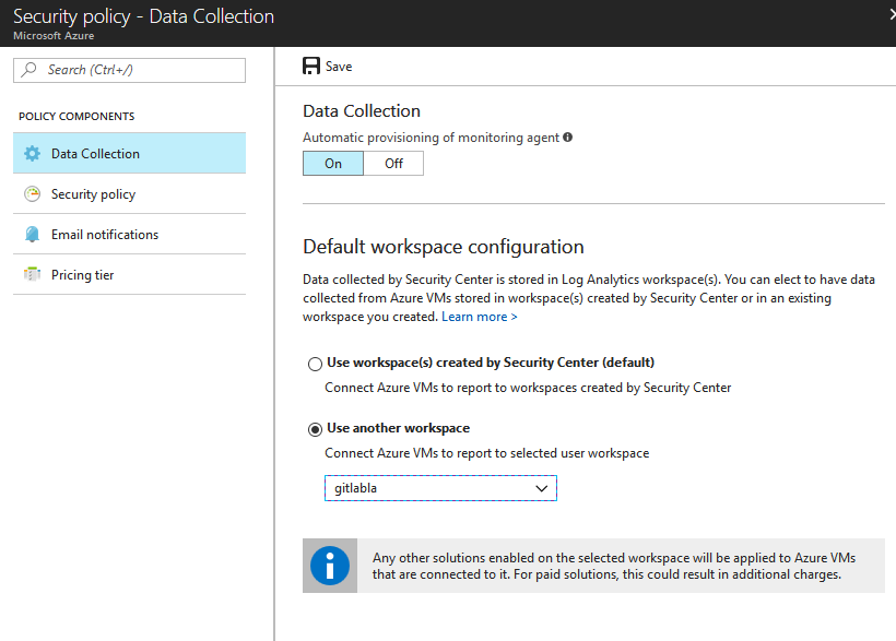 Remember to pre-create the workspace so it can be visible. At the time of this writing the workspace needs to be in the same subscription for which you configure the policy. Keep in mind that when you click save you will be asked if the agents that may already be deployed to VMs in your subscription should re-connect to the new workspace. Click Yes when you are asked about this. The actual re-connection of agents actually takes some unknown time and also no data is being transferred from the default ASC workspace to the new one. Because of those two things you should not delete the default workspace right away. My recommendations is to wait 30 days so the data in the default workspace expires before proceeding with deletion. The Actual reconnection of agents depends on the number of your VM resources but it is safe to say that for around 2 days all agents should be connected to the new workspace. There are few more things to consider when you configure Data collection policy. In order to switch from Free to Standard pricing tier you will have to go to Azure Security Center –> Security Policy –> <the name of the Log Analytics Workspace> –> Pricing Tier. Notice that we configure this on Log Analytics workspace level rather subscription level. I believe that if you configure them on subscription policy level it works only if default workspace is selected instead of another.