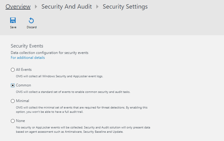 With Security and Audit solution we have a setting that we can configure the Security Events level which basically tells which security events should be ingested. By default the value is All Events and best practice is to set this to Common to avoid any overcharges. Keep in mind that there might be some additional settings that needs to be configured via local or group policy like AppLocker auditing but this blog post will not cover that. You can read about those in Inside the Microsoft Operations Management Suite book. To configure Security Events level there are two options here – from Azure Security Center or OMS Portal. Depending on the scenario you have you will have to choose one of them. OMS Portal covers all scenarios but as at some point in the future will be deprecated (this is personal view not statement by the Log Analytics/OMS product group at Microsoft) I suggest use Azure Portal when you can.