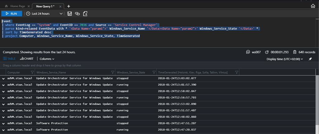 The next step is just to execute a query but before that let’s mention what we will do. We will filter on Event Id 7036 from System log. This event contains information which service has stopped or started. That information is contained in EventData column but is unstructured. By using the Log Analytics powerful language we will structure that data very nicely. This is done by executing the following query: