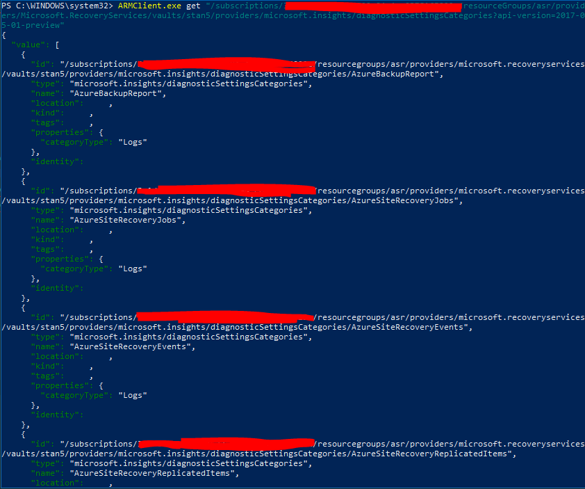 PS C:\WINDOWS\system32> ARMClient.exe get "/subscriptions/3c1c78a4-4064-4522-94c4-e0428165922e/resourceGroups/asr/providers/Microsoft.RecoveryServices/vaults/stan5/providers/microsoft.insights/diagnosticSettingsCategories?api-version=2017-05-01-preview"