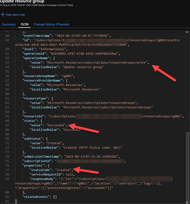 No matter that the activity log has display name of Update resource group it is actually resource group creation. You can see all values from our scope. Only category is missing but that is also in the log just not displayed in the picture.