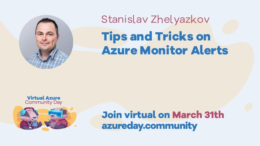 On 31st of March I will be bringing session for Azure Virtual Day. The title of the session is Tips and Tricks on Azure Monitor Alerts. I will go through the different types of Azure Monitor alerts and will share my insights on using those. You can check the full schedule of the event from the link below: