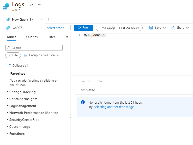 A few months ago a new API was released that allows you to delete a whole table. If you look at the picture above I have MyLog00001_CL table. When I search that table I do not have any recent data: