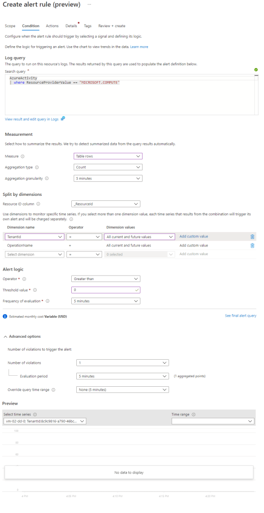 • Separate alert instance instance per results – This was possible in v1 as well but was somehow not very discoverable and limited to 3 columns you can define. For example let’s say you have Azure VM for which you monitor the free disk space on each disk. In order to get alert for each VM you want to define _ResourceId column as dimension but if you want to get separate alert instance for each disk on each VM you will need to define the column that contains the name of the disk as dimension as well. These dimensions can also serve as filter to exclude or include certain values. Keep in mind that you do not have limit for how many dimensions you can add but you have a limit of 6000 time-series. Something important to keep in mind is that if you want to add a column of type that is not string (let’s say for example array) it is best to convert it to string in inside the query.