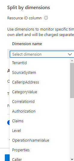 • We are scoping the alert to resource group so we have _ResourceId value for resourceIdColumn property and we are skipping adding _ResourceId to dimensions