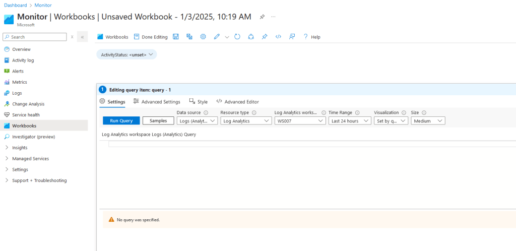 For simplicity we just going to use static value for the Log Analytics workspace we will query and use simple query as: