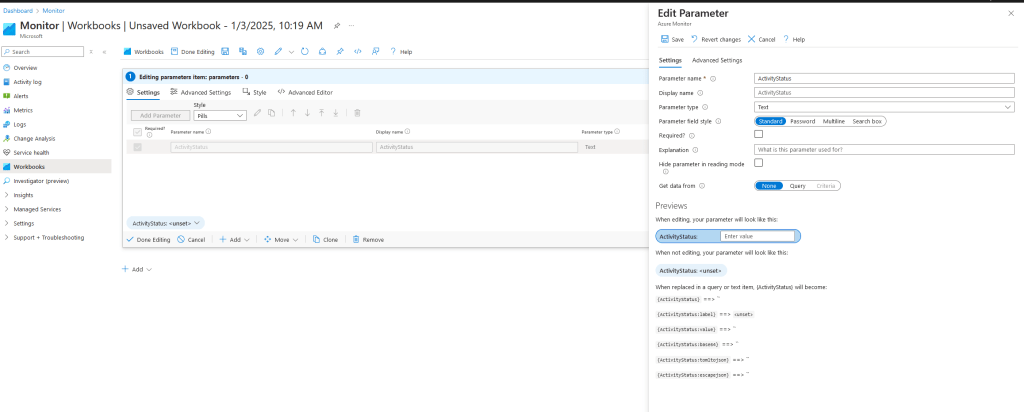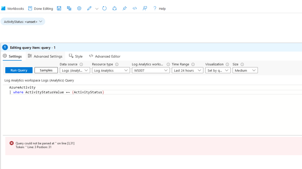 Azure Monitor workbooks are great way to visualize Azure data for monitoring and analysis. Although there is a good documentation on how to built them I would say that examples for more advanced scenarios are lacking in there. Recently I was asked a question about such scenario: “How do I set KQL query in a way that the filter for optional parameter in Azure Monitor workbook is not applied if value is not provided for that parameter?”.