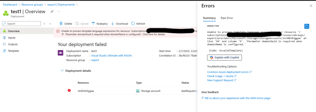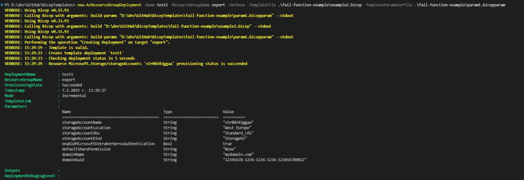 We have changed only one line of code to check for the value of domainGUID and if it is empty to fail the deployment with specific message that will stir the end user to change its Bicep parameters file and re-deploy. Let’s redeploy with our parameters file the new template: