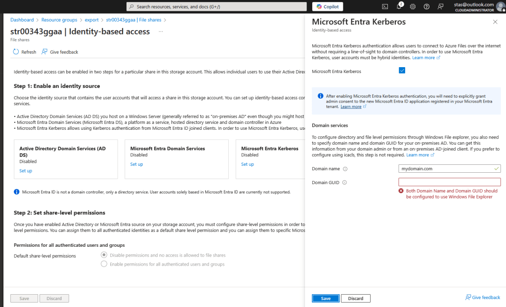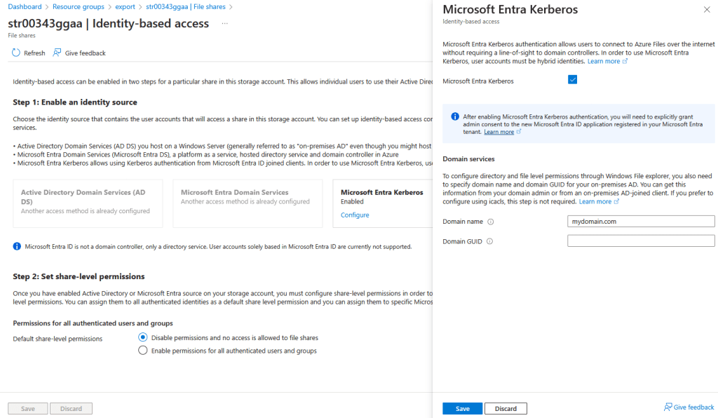 To visualize better identity-based authentication let’s see how it looks in Azure Portal -> Storage Account -> Data Storage -> File Shares -> Identity-based access.