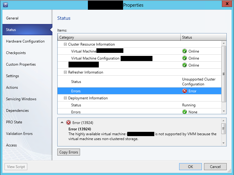 - You receive the following error: Error (13924) The highly available virtual machine (VMNAME) is not supported by VMM because the virtual machine uses non-clustered storage.