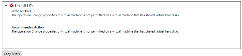 The operation Change properties of virtual machines is not permitted on a virtual machine that has shared virtual hard disks.