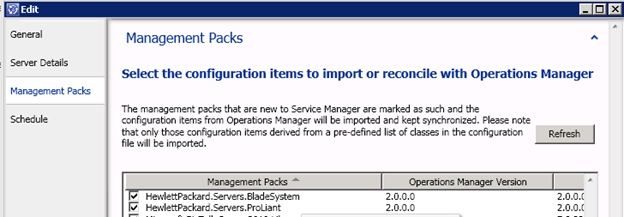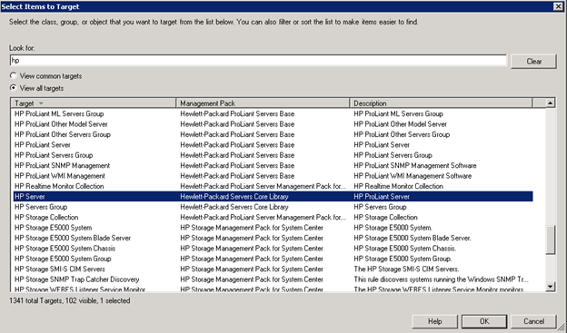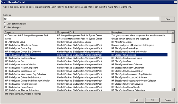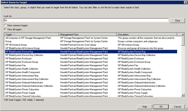 18. We found that the the information that we want to sync is contained in two management packs – Hewlett-Packard Servers Core Library and Hewlett-Packard BladeSystem Management Pack.