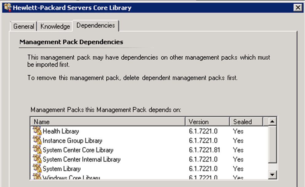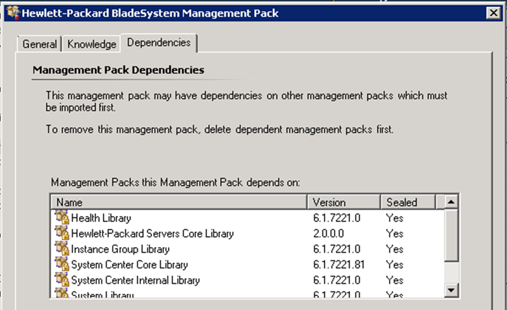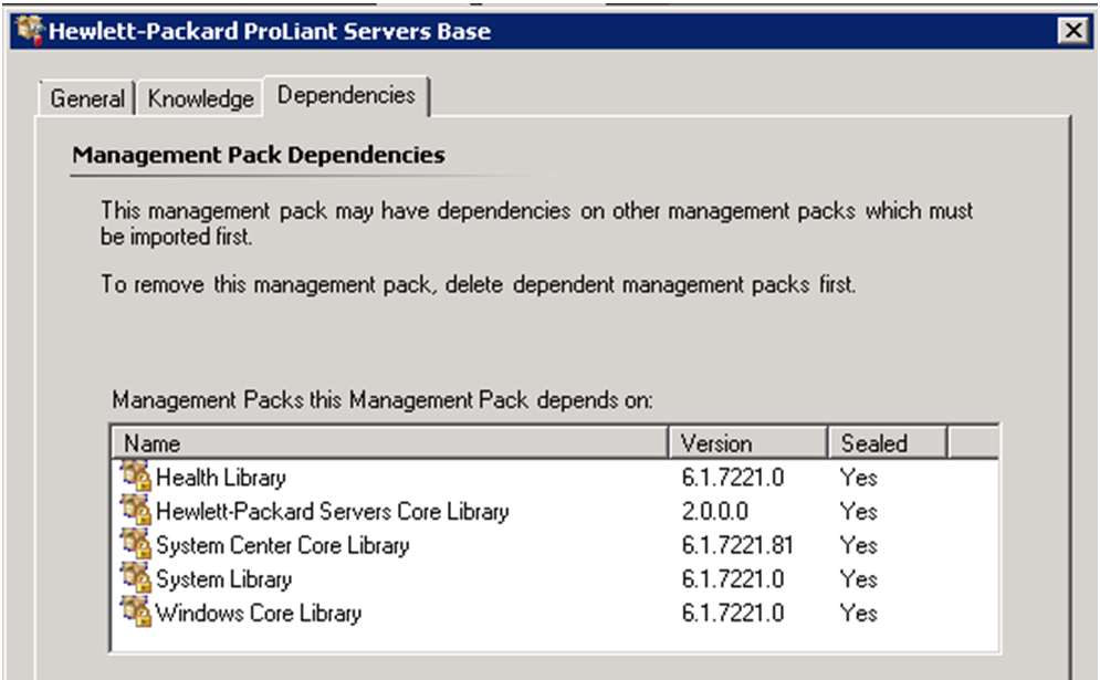 20. In General tab you under ID you will see thee name of the management pack. In Dependencies tab that you will see which other management pack you should also import in SCSM. If you do not have these MPs in your SCSM environment you will not be able to import the HP Management Packs.