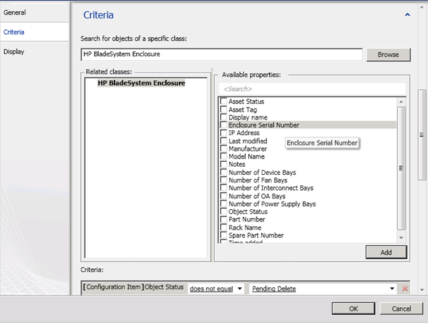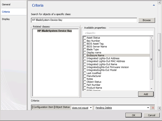 12. “HP BladeSystem Enclosure” is the main class that holds information for HP Enclosures and it is located in Hewlett-Packard BladeSystem Management Pack. Select it and click OK.