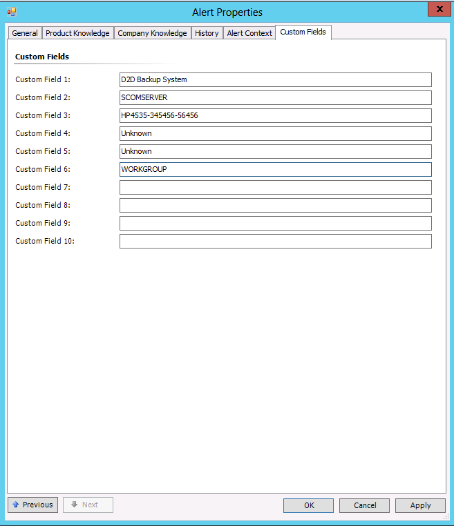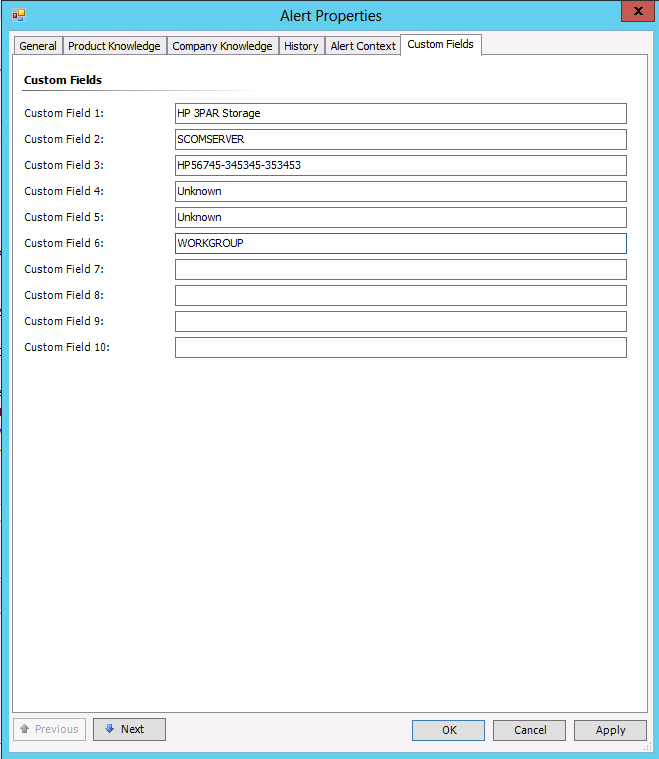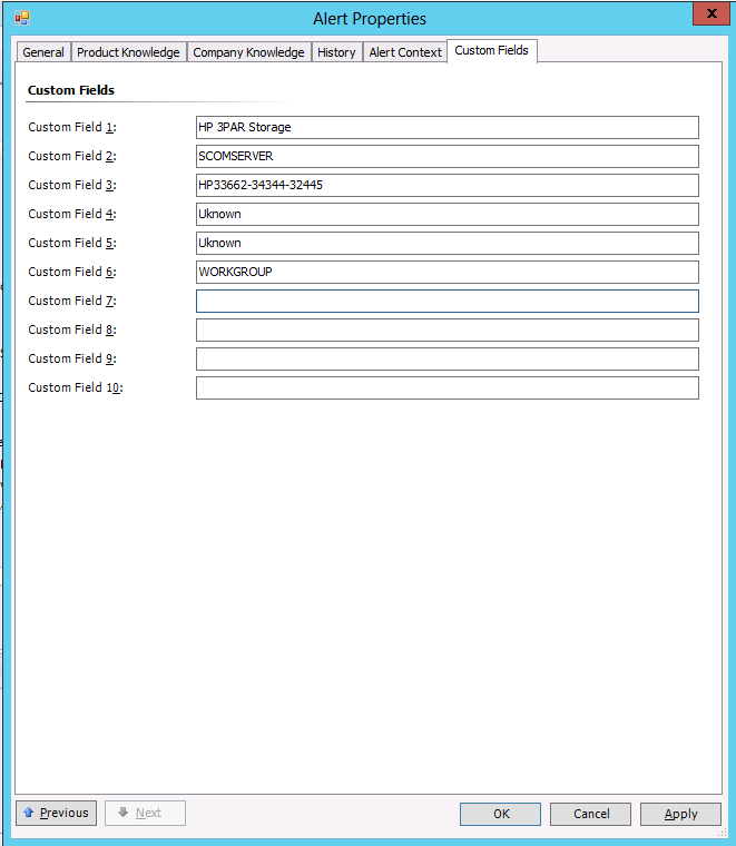 Lets say that we have two Support Groups – Backup and Storage. Those two Support Groups are using one management pack in SCOM to monitor their devices. So in SCSM we need to configure: alerts that are coming from devices supported by Backup Support Group to be assigned to Backup team and alerts that are coming from devices supported by Storage to be assigned to Storage team. Most of you will probably suggest that we can put these devices in groups in SCSM and route alerts based on that or even easier we can route them based on Monitoring Class. But these two options are also not available because all these devices are monitored by SNMP so they they do not have CI record in SCSM and all alerts come from the server where the management pack is installed in our case this is the RMS server. Such management pack is HP Storage Management Pack. This management pack monitors various storage devices manufactured by HP and all is put in one MP file. Lets say we want to monitor 3PAR Storage, SAN Switches, D2D Devices and Tape Libraries with this management pack. All of these device are monitored by SNMP and we want 3PAR and SAN switches alerts to go to Storage Support Group and D2D device and Tape Libraries alerts to go Backup Support Group. When alerts for these devices are created in SCOM the first 6 custom fields are filled with values: