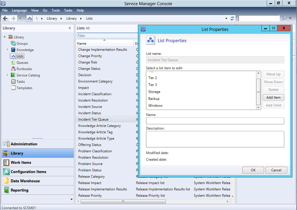 If we go in SCSM console –> Library –> Lists and open the properties of Incident Tier Queue list we can see that we have 3 Support Groups – Storage, Backup and Windows: