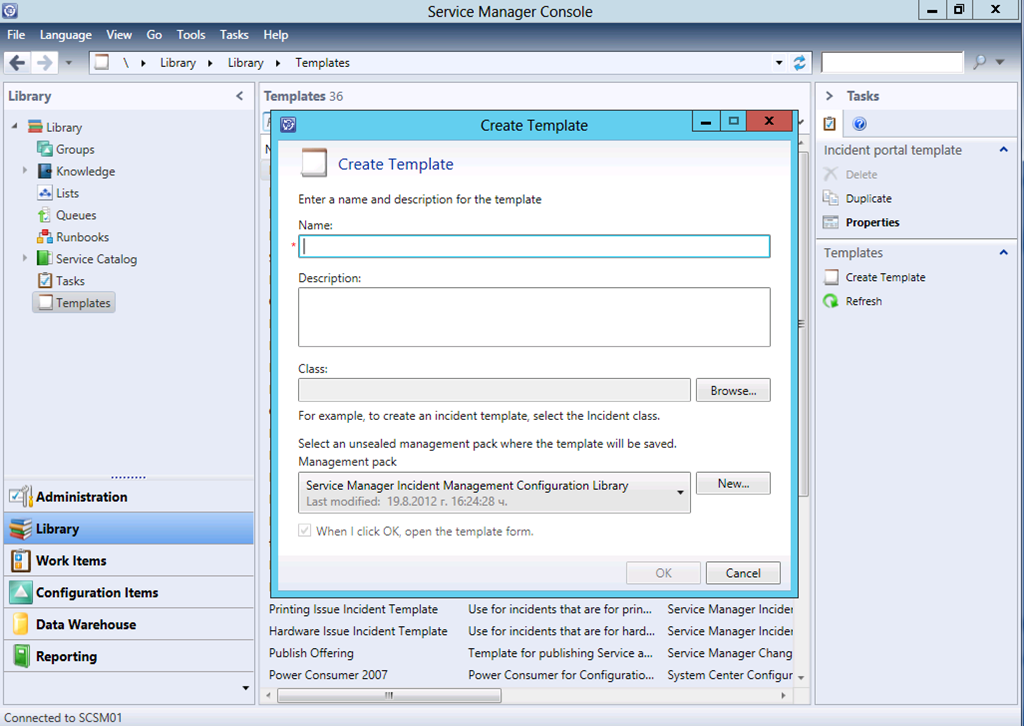 So we need to configure 2 Templates in SCSM – one for Storage and one for Backup Support Group. We go to Templates and from Action Menu we choose Create Template and new window appears: