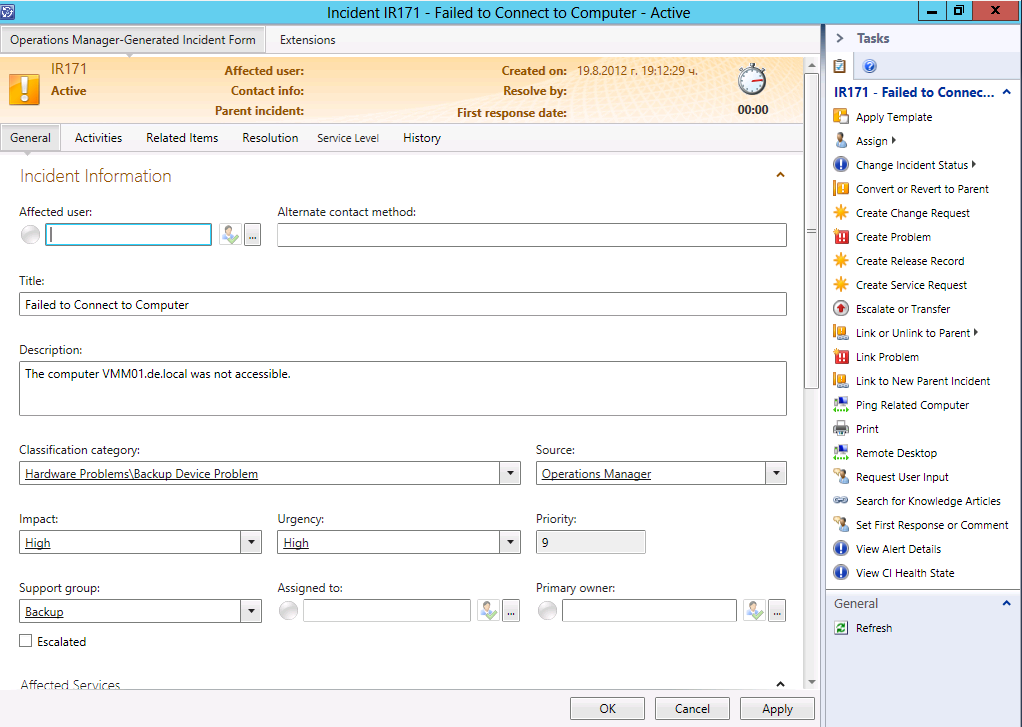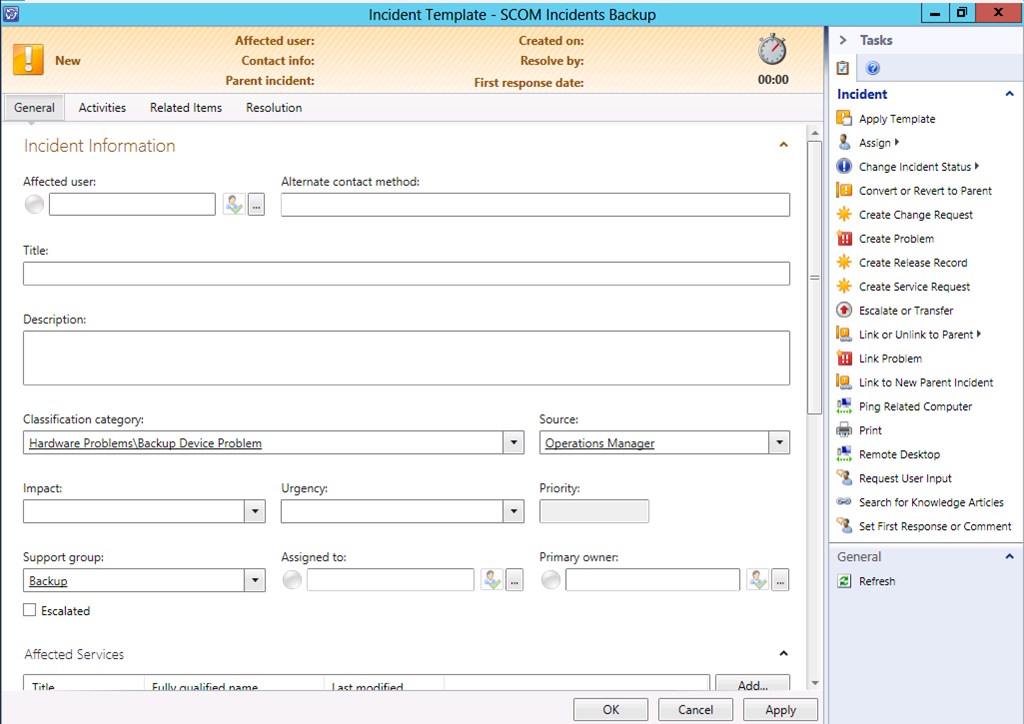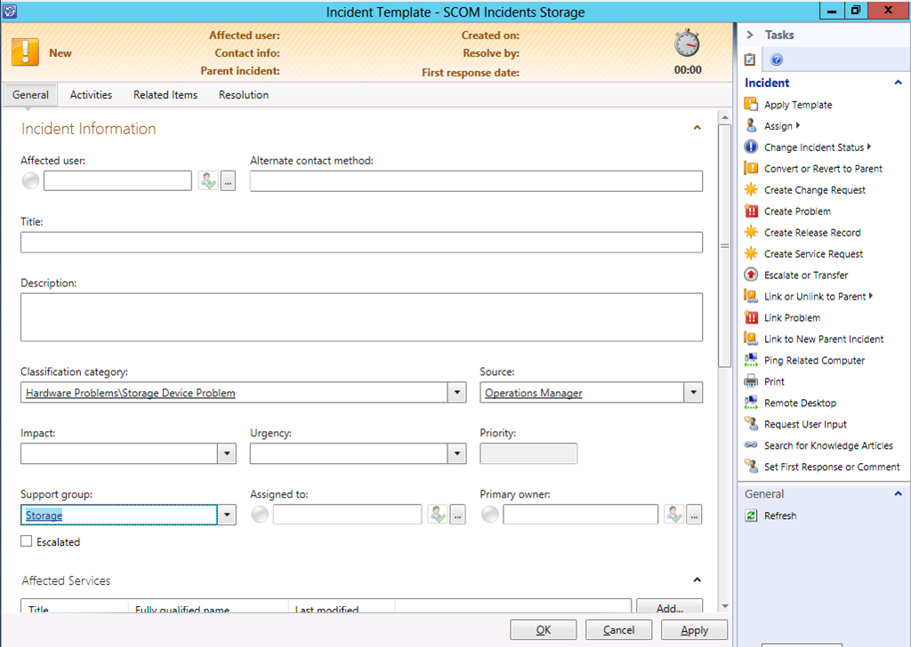 We can name the templates “SCOM Incidents Storage”, for class to choose Incident and for management pack you we can select a custom management pack where we store such settings. When we click OK an incident form will open. This is our template and here we have to fill the fields that will be changed when alert meets certain routing rule criteria. In our case we can populate Classification category, Source and Support group: