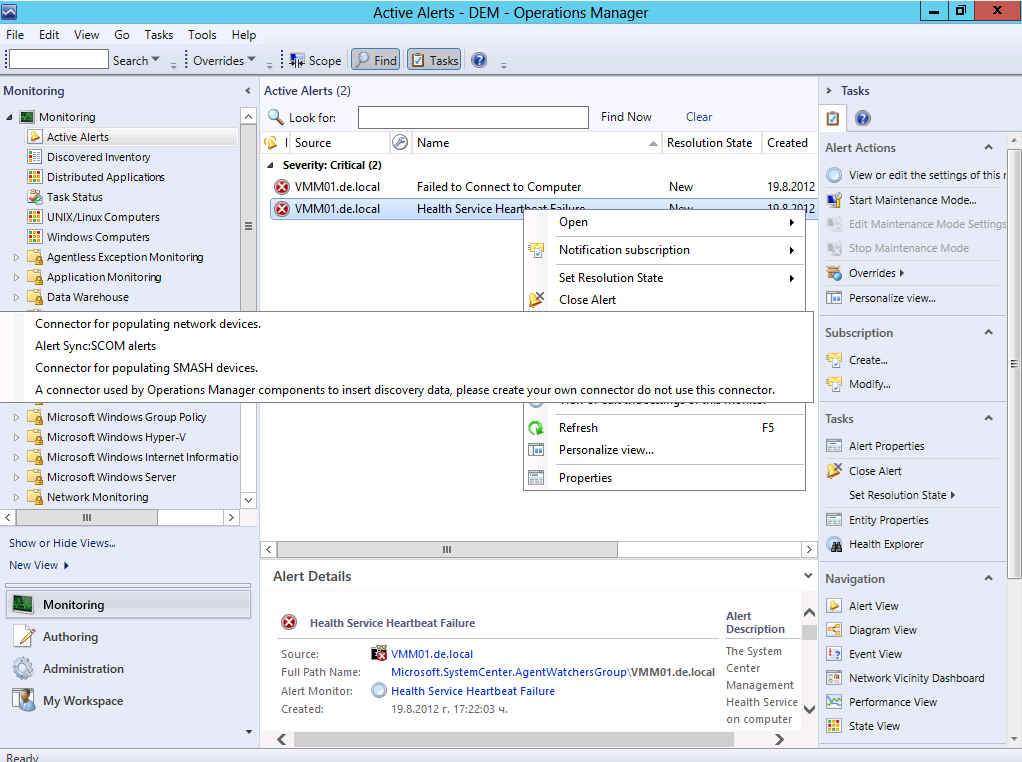 After saving the SCOM Alert Connector configuration I’ve modified the custom fields of two alerts in SCOM and forward them to SCSM: