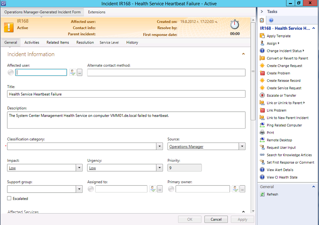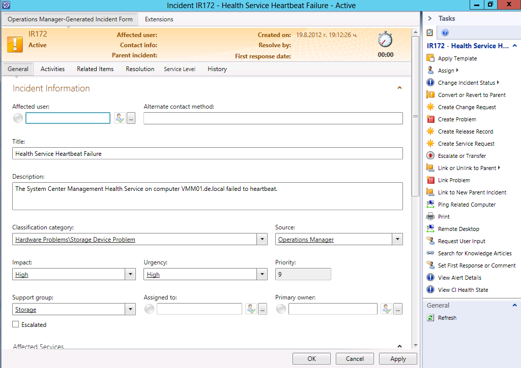 As you can see from the screenshot the Storage template I’ve created wasn’t applied to this incident because Support Group field was empty which meant that the default Operations Manager Incident Template was applied and the alert didn’t matched my routing criteria. At this point I understood that I have to make some troubleshooting in order to solve this.